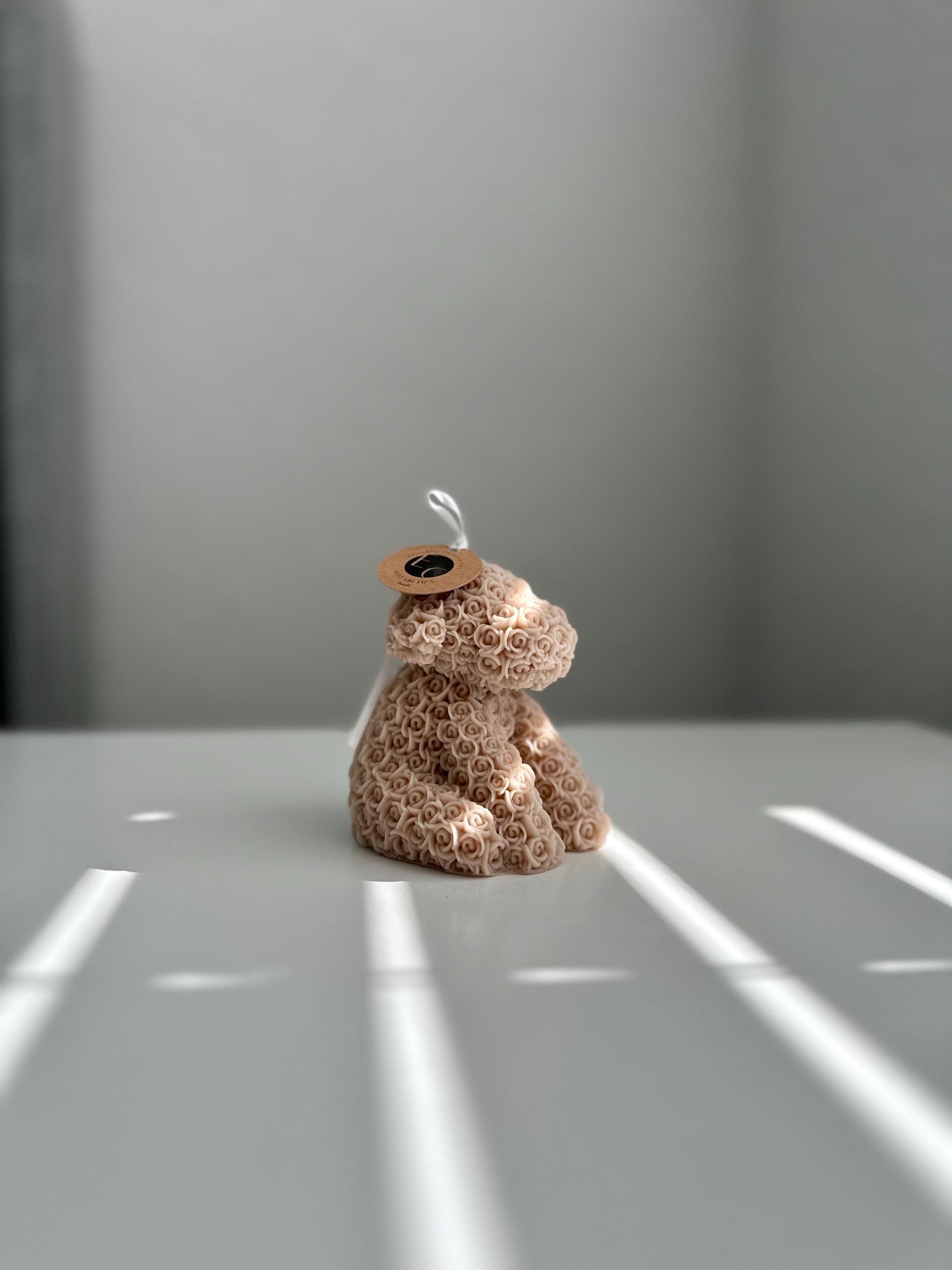 This charming candle is shaped like an adorable puppy, completely covered in delicate rosebuds. Each detail is handcrafted with care, making it a perfect gift for lovers of unique décor. It adds a cozy and stylish touch to any space. Made from high-quality wax, this candle can be used as a decorative piece or to create a warm, relaxing atmosphere.